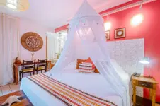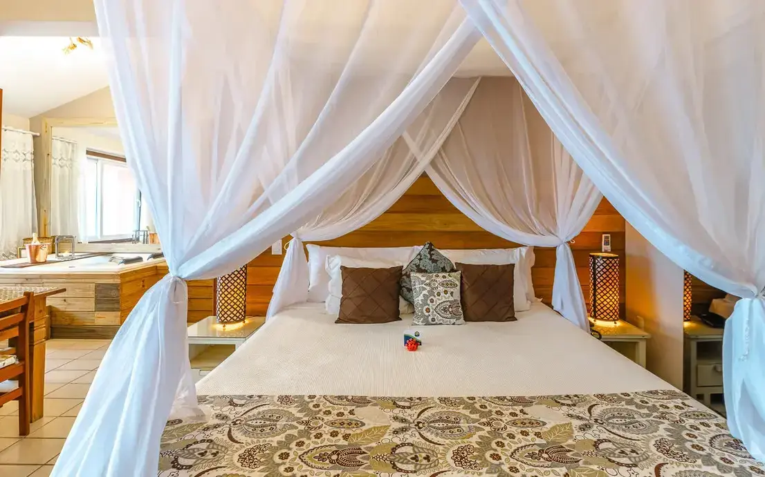 Essa suíte de frente para a enseada tem uma energia mágica que transmite tranquilidade e paz. Cores quentes, mandala e enfeites orientais nos remetem à cultura asiática deixando o ambiente muito elegante e harmonioso. Da sacada o visual é lindo e pode se observar o nascer do sol.