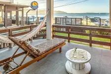 • Varanda com vista panorâmica para o mar, com churrasqueira, pia, espreguiçadeira e rede.