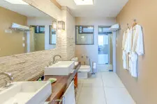 • Banheiro privativo amplo com duas duchas, duas cubas, secador de cabelo, espelho de aumento, roupão e aquecimento central de água