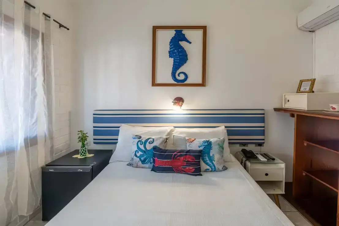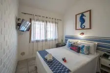 Suíte em homenagem ao mar que nos encanta todos os dias e que nos embala à noite sempre enchendo nossos olhos de beleza. Não poderíamos deixar de citá-lo em nossas homenagens. Suíte aconchegante com decoração marinha e janela lateral no andar térreo.